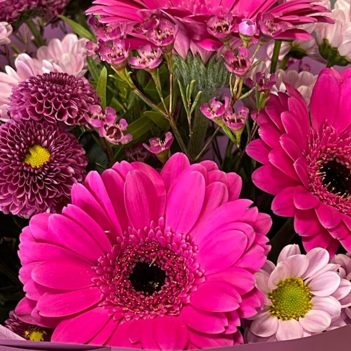 Ваксфлауэр – 1 шт.Лента атласная – 1 шт.Гербера – 3 шт.Сантини – 5 шт.Фисташка – 1 шт.Упаковка дизайнерская – 1 шт.