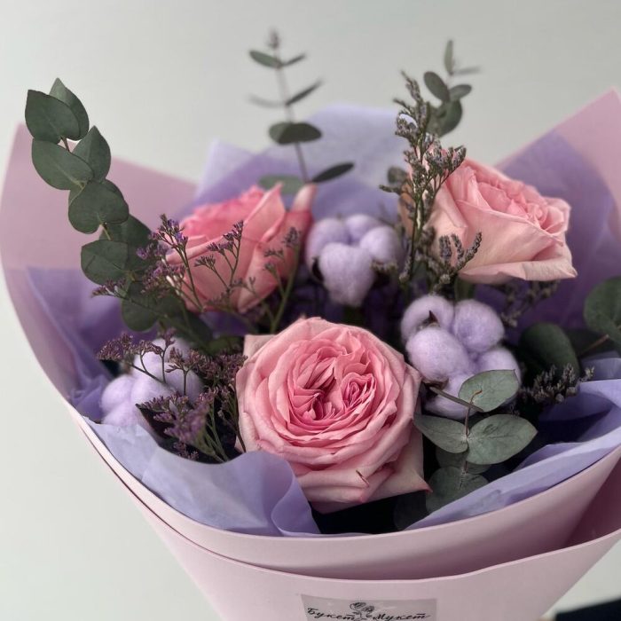 Лимониум – 1 шт.Хлопок – 3 шт.Эвкалипт – 2 шт.Лента атласная – 1 шт.Тишью – 1 шт.Фисташка – 1 шт.Фоамиран (упаковка) – 1 шт.роза пинк охара(ароматная) – 3 шт.