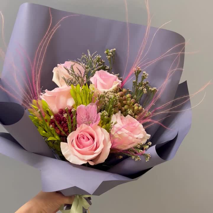Роза Эквадор – 5 шт.Альстромерия – 1 шт.Ковыль – 2 шт.протейный микс – 1 шт.Упаковка дизайнерская – 1 шт.Лента атласная – 1 шт.