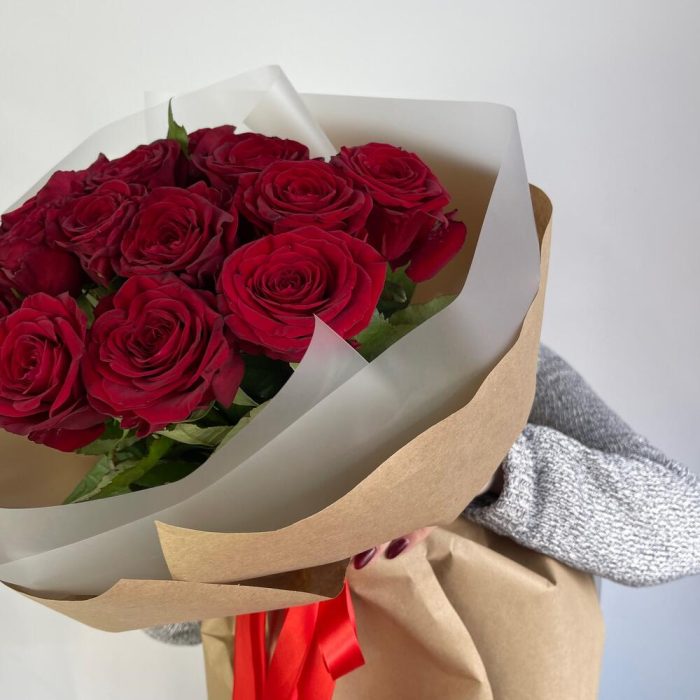 Роза – 15 шт.Лента атласная – 2 шт.Крафт – 2 шт.Пленка матовая – 2 шт.